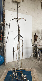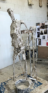 Beim ersten Atelierbesuch im April war die Figur in ihrer großen Präsenz schon gut erkennbar, aber noch nicht im Detail herausgearbeitet. Blaue Linien markierten Mittelachsen und Veränderungsabsichten, die Oberfläche war noch grob, der Arbeitsprozess sichtbar.