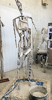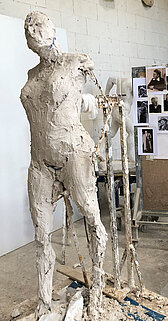 Ich beginne eine Figur oft in Ton, habe mich aber diesmal für Gips entschieden. Auch hier habe ich mit dem Körper begonnen und die Kleidung sozusagen draufgepackt.