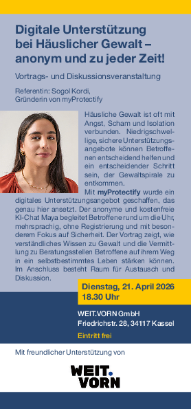 Häusliche Gewalt ist oft mit Angst, Scham und Isolation verbunden. Niedrigschwellige, sichere Unterstützungsangebote können Betroffenen entscheidend helfen und ein entscheidender Schritt sein, der Gewaltspirale zu entkommen. Mit myProtectify wurde ein digitales Unterstützungsangebot geschaffen, das genau hier ansetzt. Der anonyme und kostenfreie KI-Chat Maya begleitet Betroffene rund um die Uhr, mehrsprachig, ohne Registrierung und mit besonderem Fokus auf Sicherheit. Der Vortrag zeigt, wie verständliches Wissen zu Gewalt und die Vermittlung zu Beratungsstellen Betroffene auf ihrem Weg in ein selbstbestimmtes Leben stärken können. Im Anschluss besteht Raum für Austausch und Diskussion.